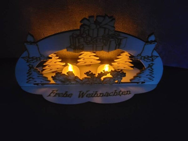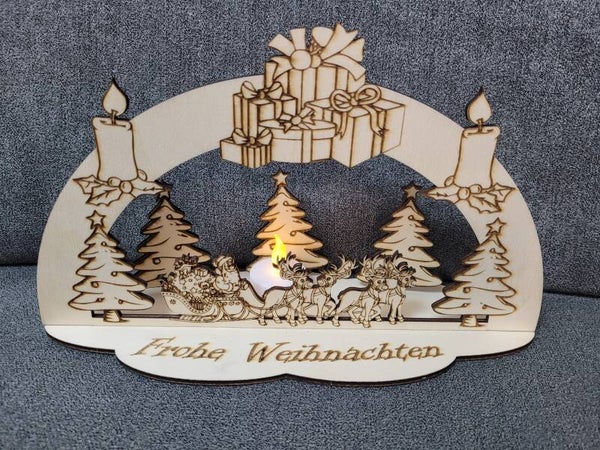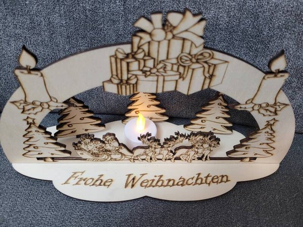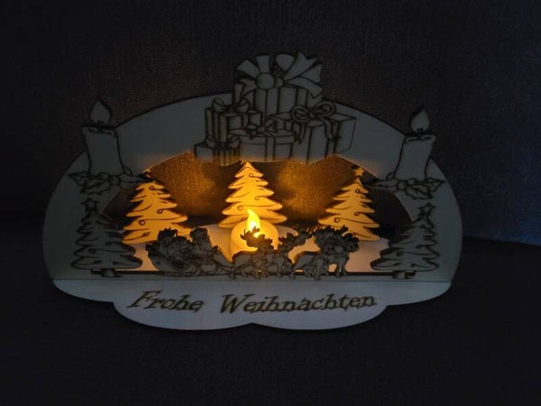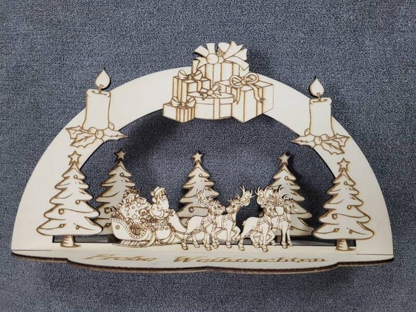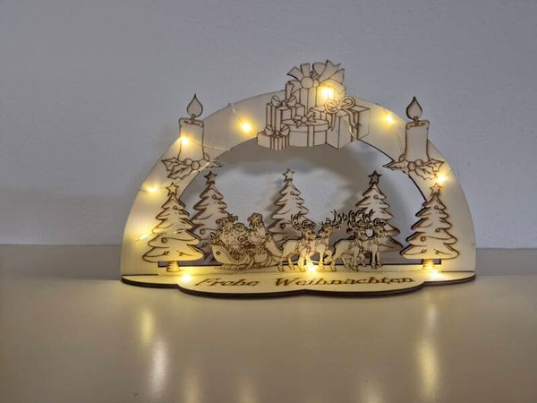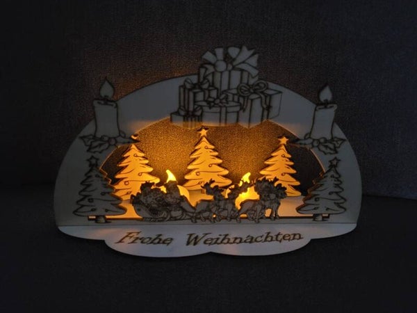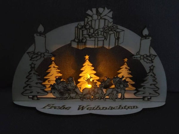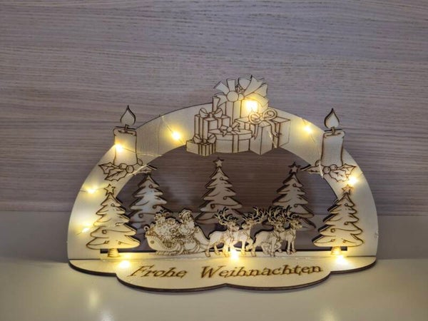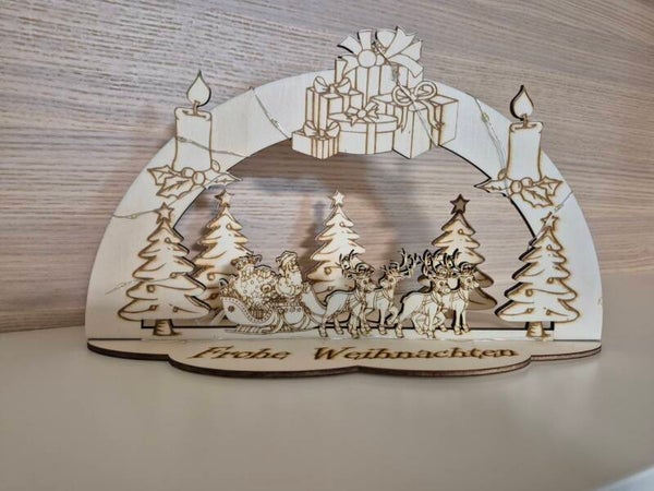 Bringe festliche Stimmung in dein Zuhause mit dieser liebevoll gestalteten Weihnachtsdekoration aus Holz. Die filigran ausgeschnittene Szene zeigt den Weihnachtsmann in seinem Schlitten, gezogen von Rentieren, umgeben von geschmückten Tannenbäumen und Geschenken. Warmweiße LED-Lichter verleihen dem Motiv einen gemütlichen Glanz und sorgen für eine stimmungsvolle Atmosphäre in der Adventszeit.