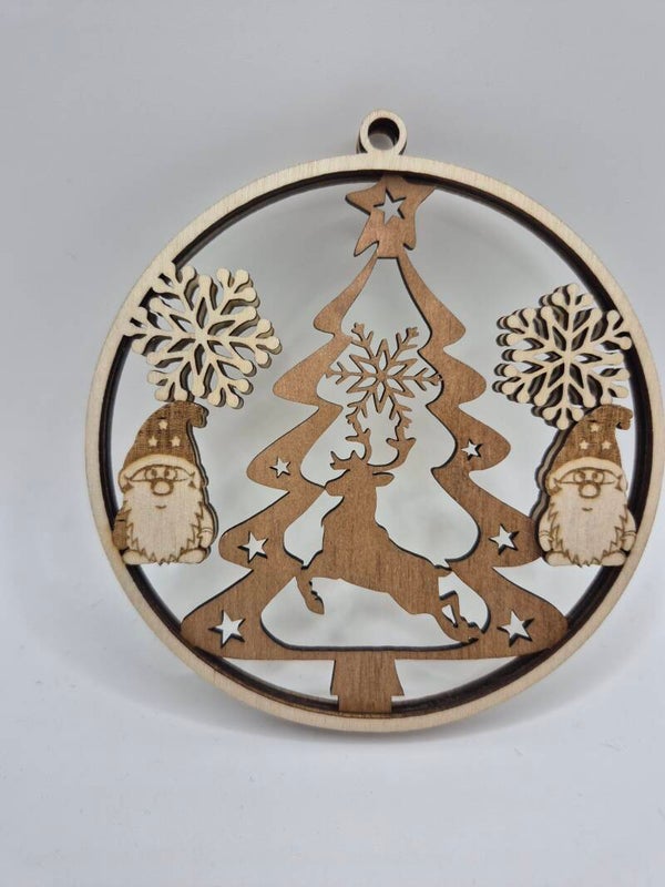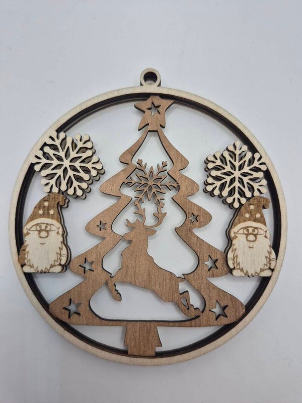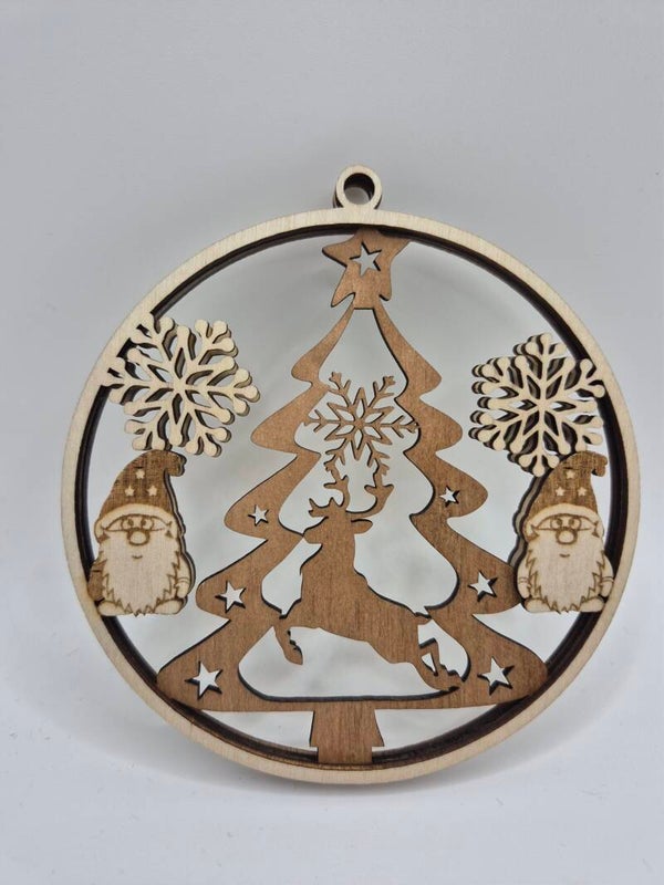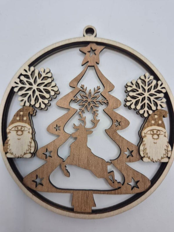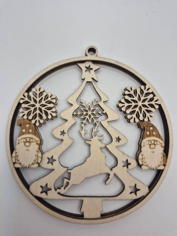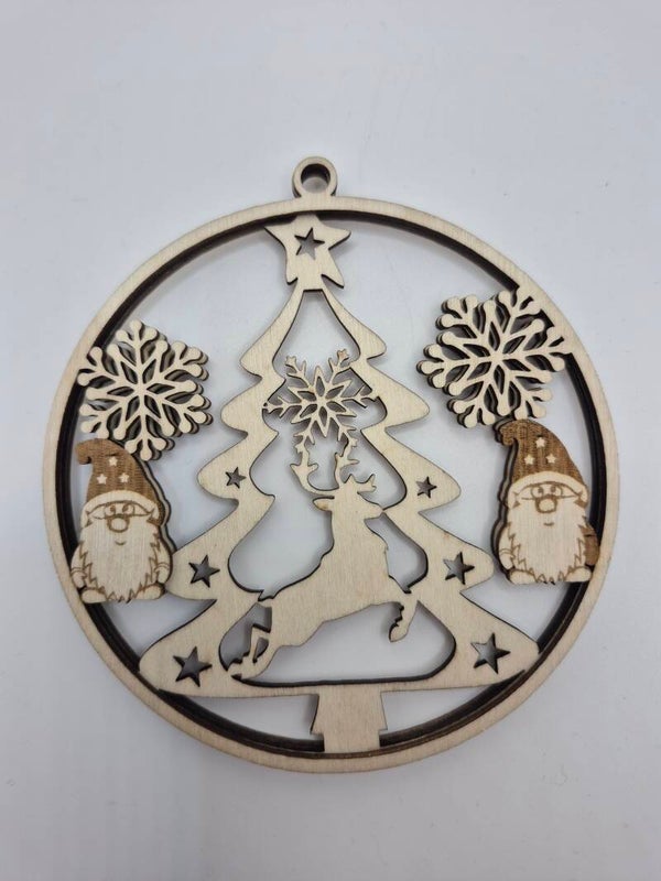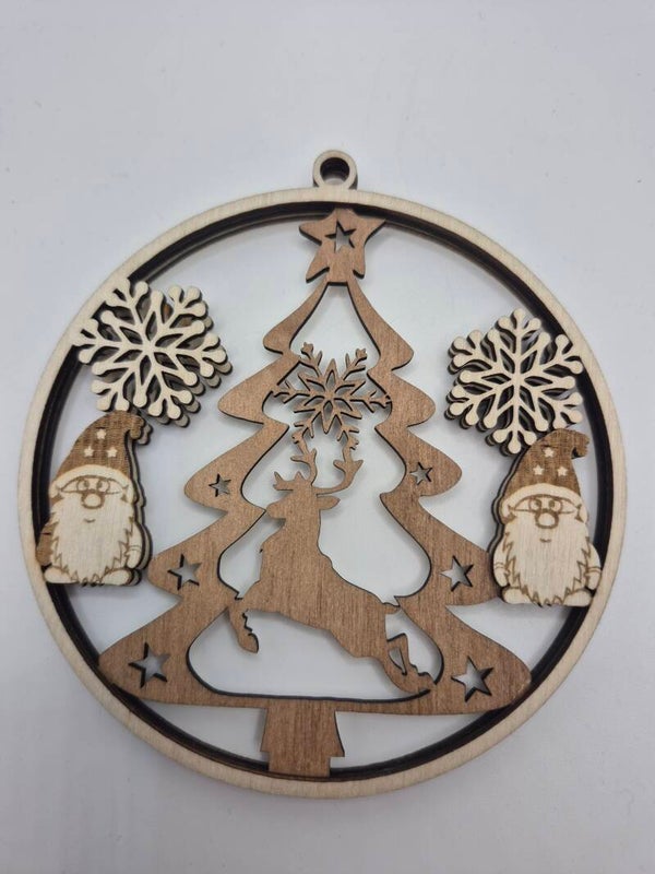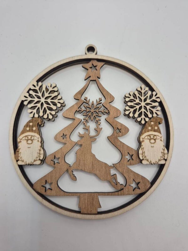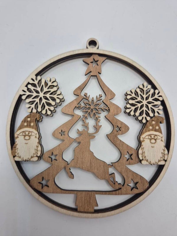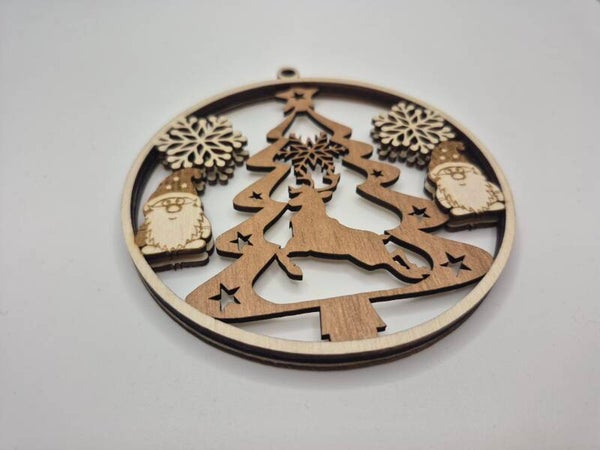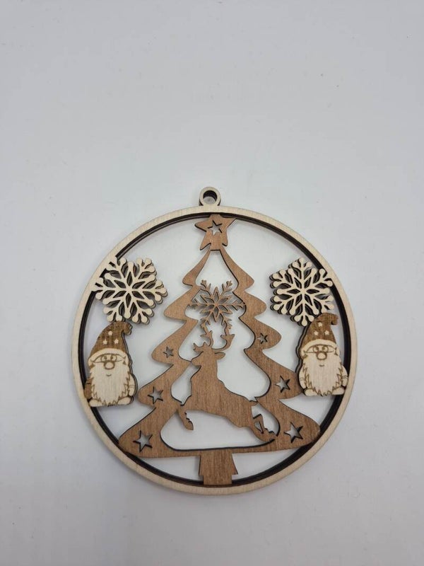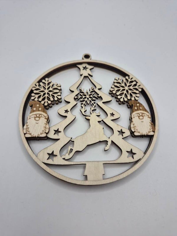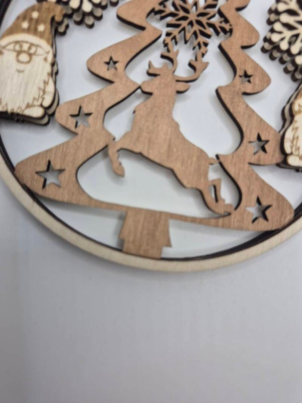 Dieser wunderschöne Anhänger aus Holz zeigt ein detailreiches Motiv mit Tannenbaum, Rentier, Schneeflocken und kleinen Wichteln – liebevoll aus hochwertigem Naturholz gelasert.